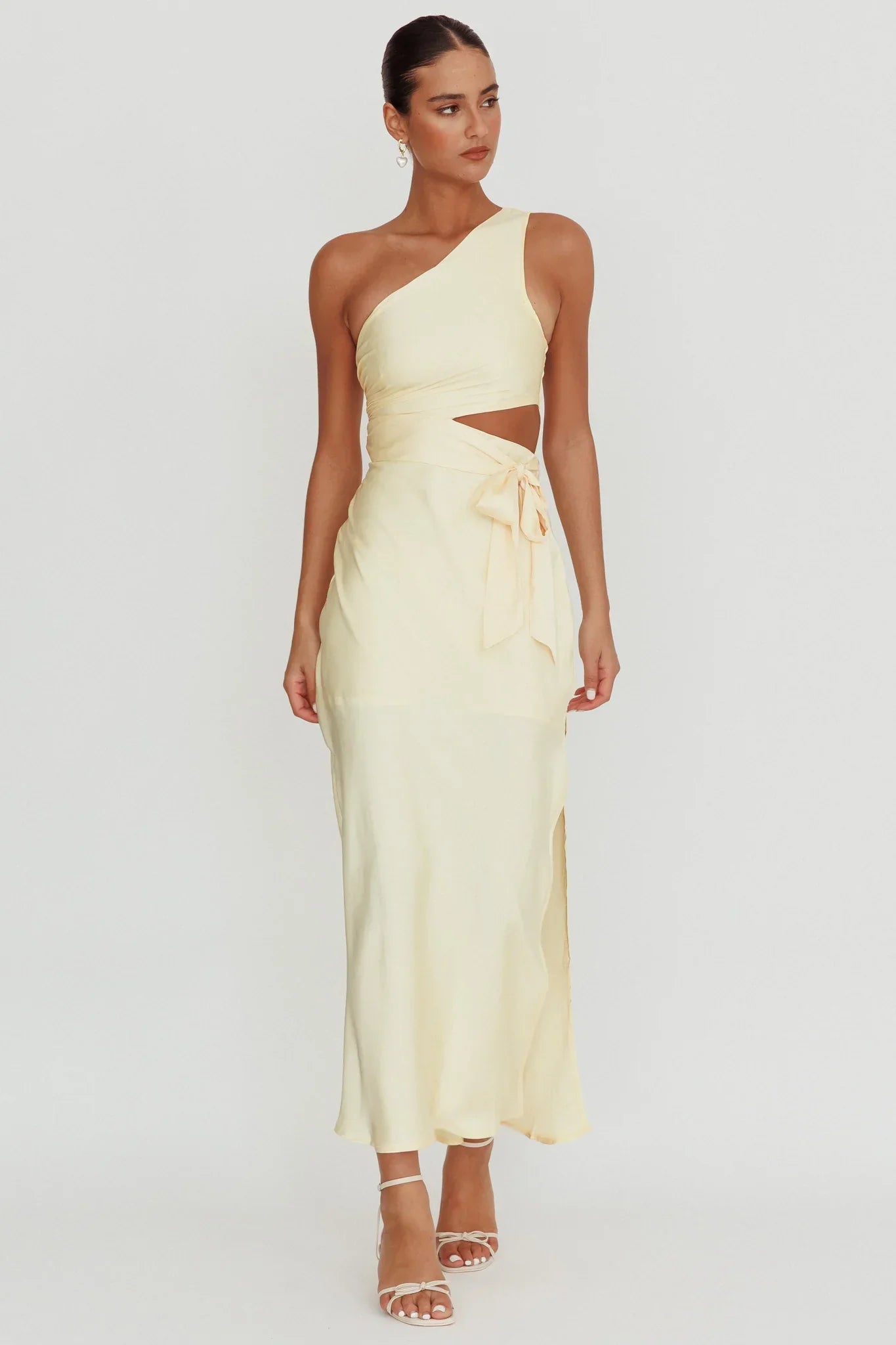 Elevate your evening elegance with our Abloom maxi dress. It boasts a captivating one-shoulder design and delicate side bow detail. The waist cut out adds a touch of allure, accentuating your curves. Whether you're attending a gala or going on a romantic date, this dress is your ticket to effortless glamour.