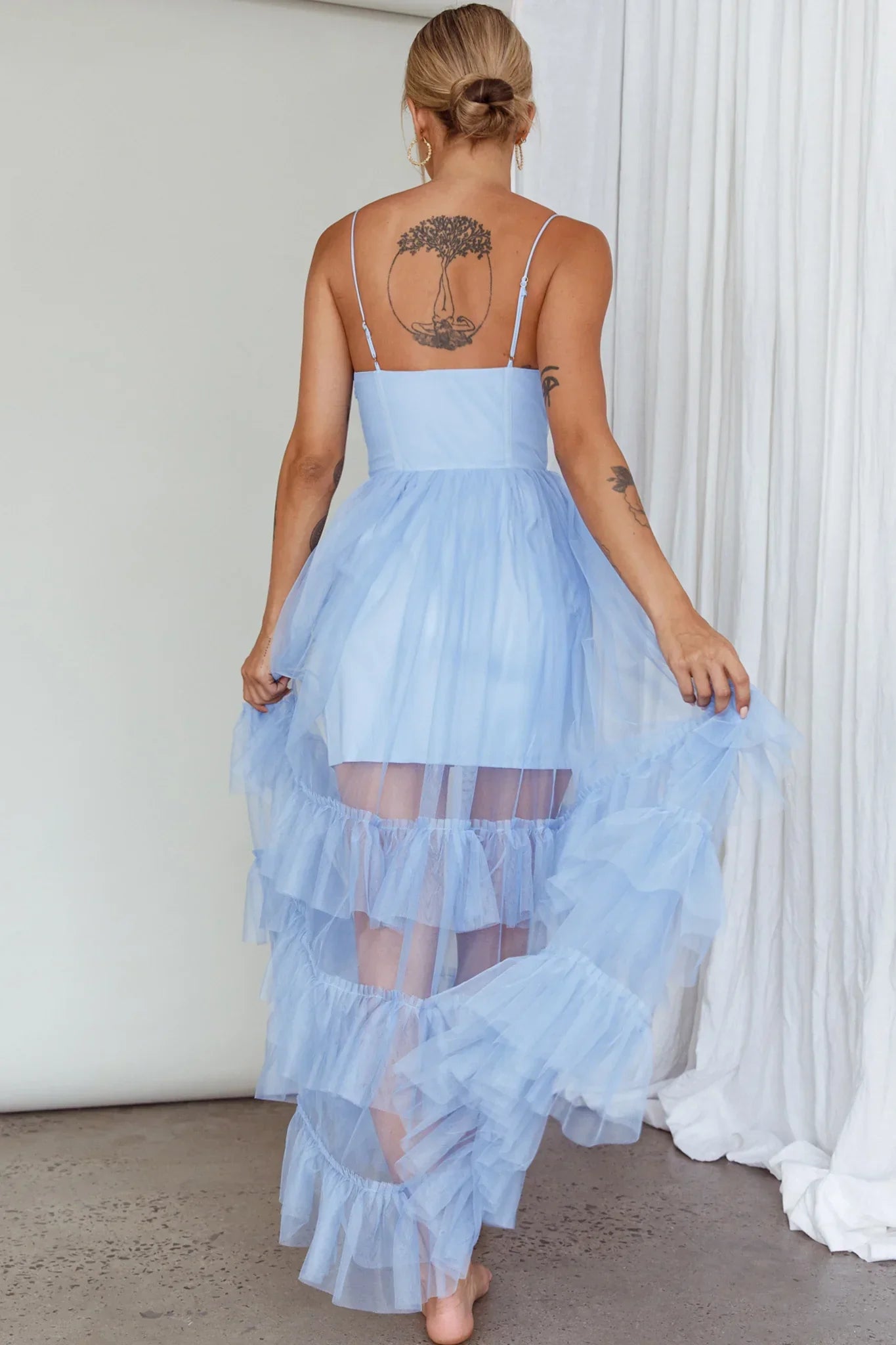 You'll get swept off your feet in our stunning Moonlight Sonata dress. Featuring romantic, ruffle trim in the skirt and a gorgeous sheer overlay. It's perfect for a wedding or special occasion. Team it with diamante mules and a clutch for an unforgettable look.